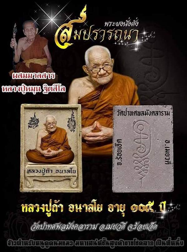 หลวงปู่ถ้า อนาลโย พระเกจิอาจารย์ 6 แผ่นดินอายุ 108 ปี แห่งวัดป่าทศพลมังคลาราม  จังหวัดร้อยเอ็ดที่ขึ้นชื่อในเรื่องของวิชามหาลาภ เมตตา มหานิยมมากถึงขนาดที่ว่าสามารถให้หนูที่เป็นคู่อริกับแมวมาดูดนมแมวได้เป็นที่น่าอัศจรรย์