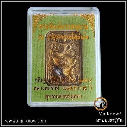 สำหรับเหรียญหล่อรุ่นนี้จัดสร้างล้อพิมพ์พระพุทธเจ้าประทับสัตว์พิมพ์ขี่หนุมานของหลวงพ่อปาน วัดบางนมโค เพื่อบูชาคุณของหลวงพ่อปาน เกจิอาจารย์ต้นตำรับพระพุทธเจ้าประทับสัตว์ โดยทำเป็นเนื้อทองผสมชนวนเก่า ลักษณะด้านหน้าเป็นพิมพ์พระพุทธเจ้าประทับหนุมานส่วนด้านหลังนั้นเป็นยันต์บารมีสามสิบทัศน์ ที่เป็นยันตืครูประจำตัวของหลวงพ่อรักษ์ โดยพระรุ่นนี้หลวงพ่อรักษ์ท่านทำการอธิษฐานจิตปลุกเสกเดี่ยวตลอดไตรมาส จึงขลังและมีประสบการณ์สูงครับ